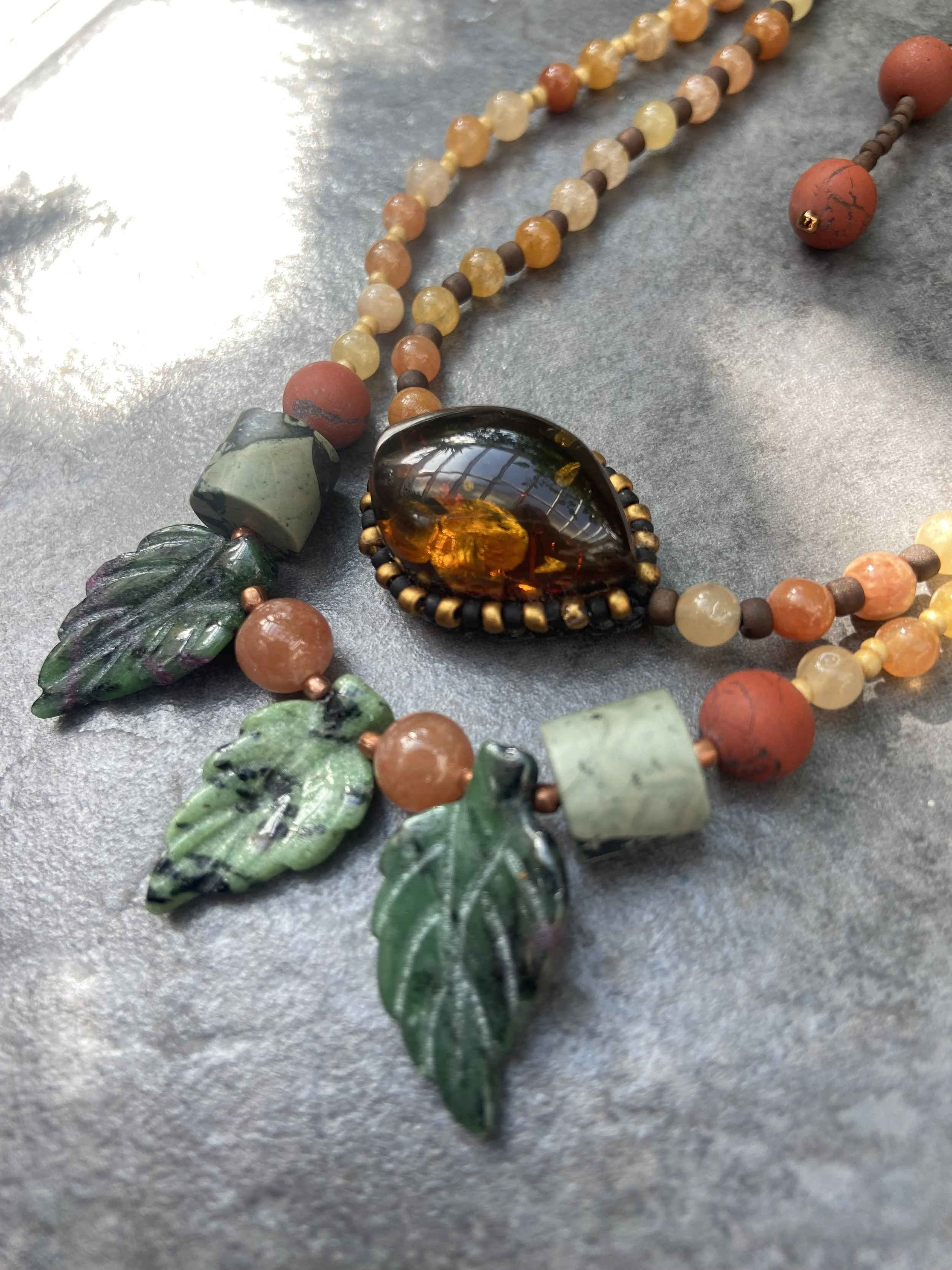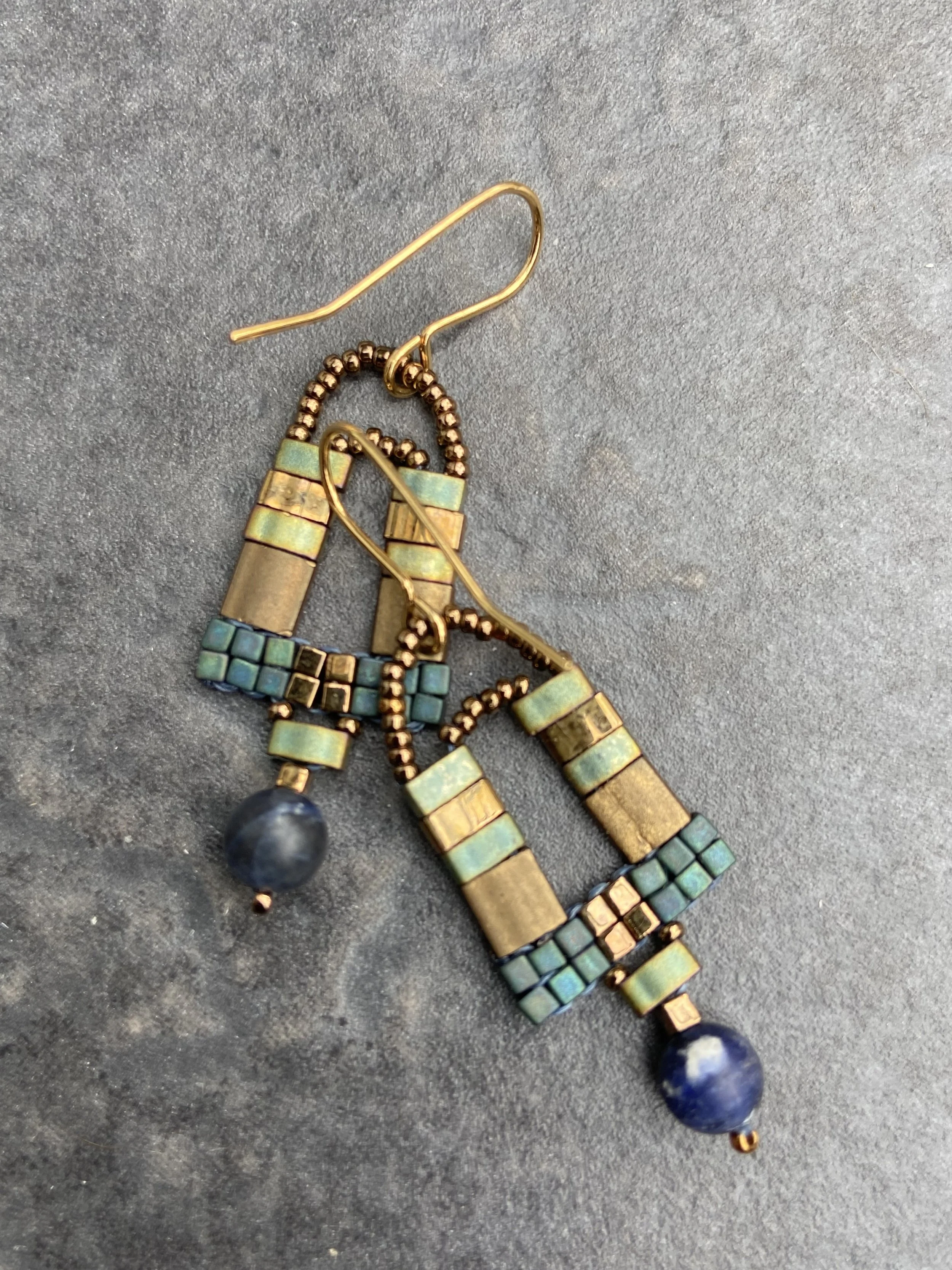 Inspired by the nature, shape and vibrancy of the beads and natural stone cabochons, she hand weaves and sews earrings, chokers, necklaces and brooches. Colour interaction continues to fascinate and is a strong contributing factor to her designs. Sam endeavours to create high quality adornment which reflects the time and effort put into the fine details, drawing from her extensive collection of Japanese and Czech glass seed beads, Freshwater pearls, gemstones and vintage buttons and ephemera. Her work has a vintage and tactile quality.